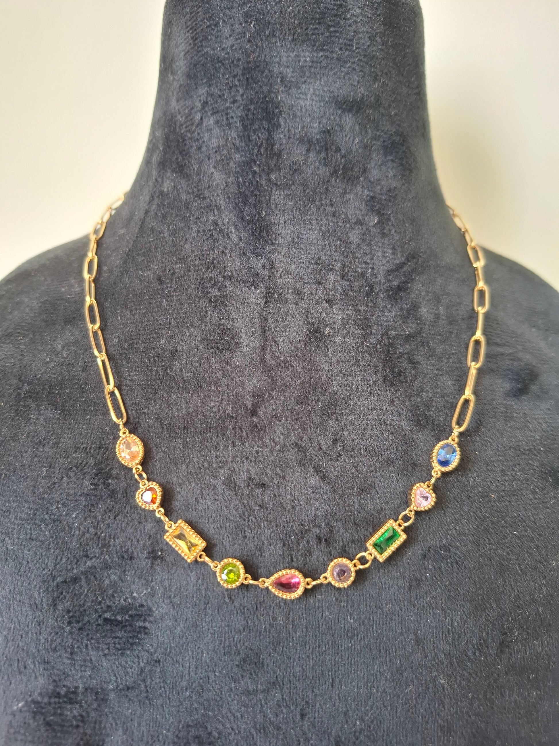 A dainty gold bracelet adorned with vibrant multicolored stones. Adds just the right pop of color to your everyday or dressy looks.