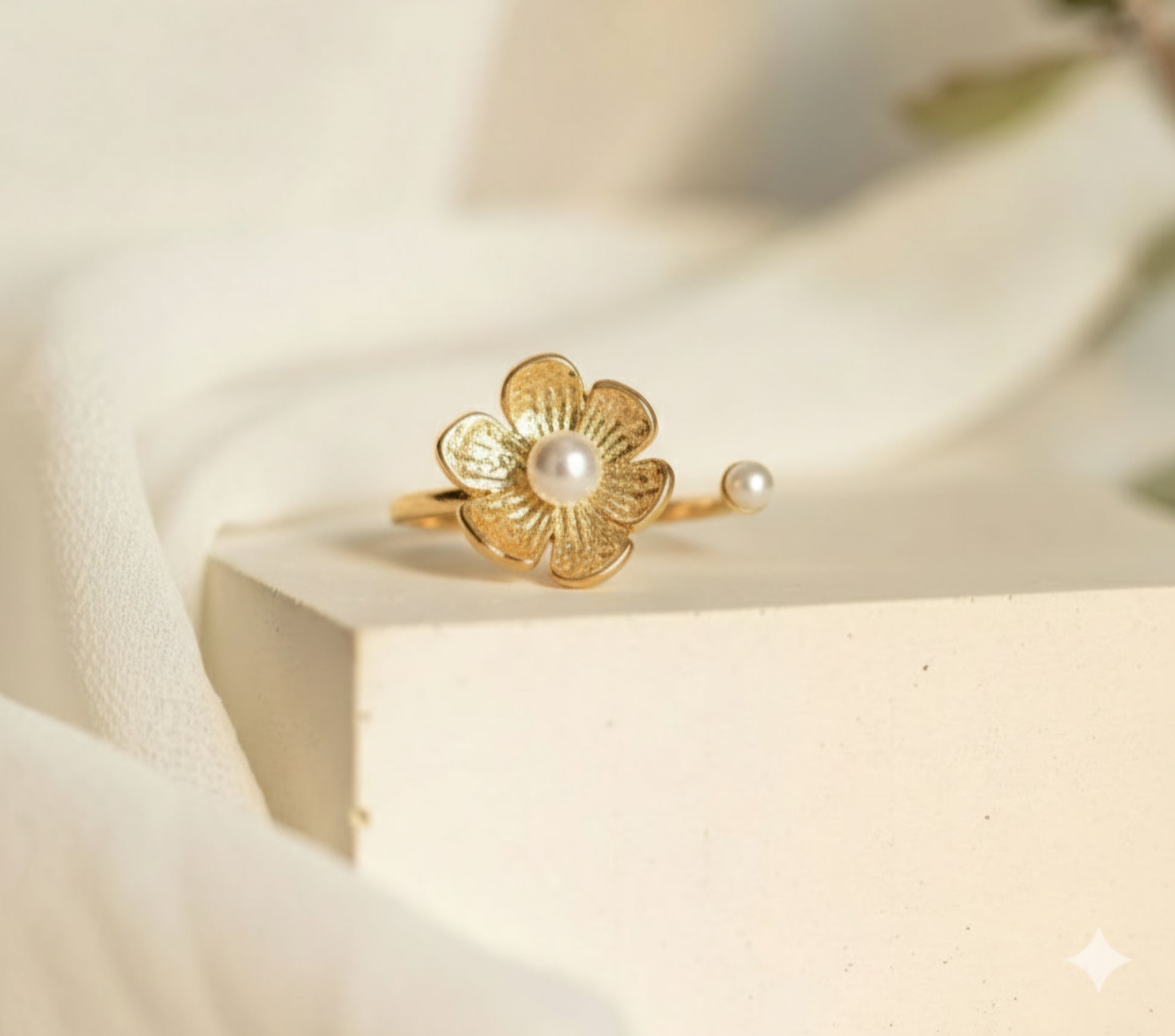 A delicate gold-plated floral ring, adorned with lustrous pearls at its center, capturing the charm of blooming blossoms with timeless elegance.
