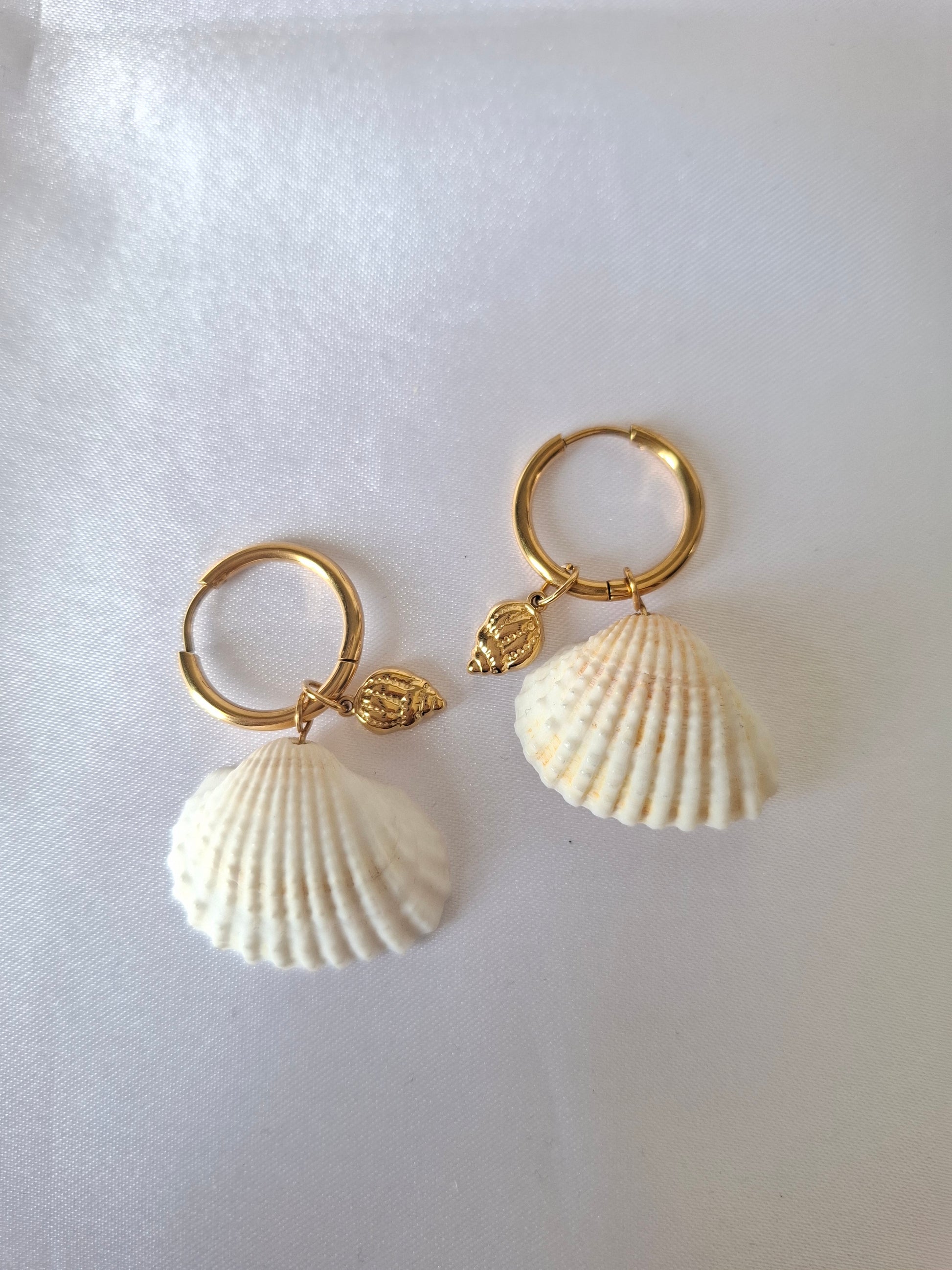 Minimal yet bold, these gold hoops with natural scallop shell and mini conch charm are a seaside dream. A statement piece that feels effortless and chic.