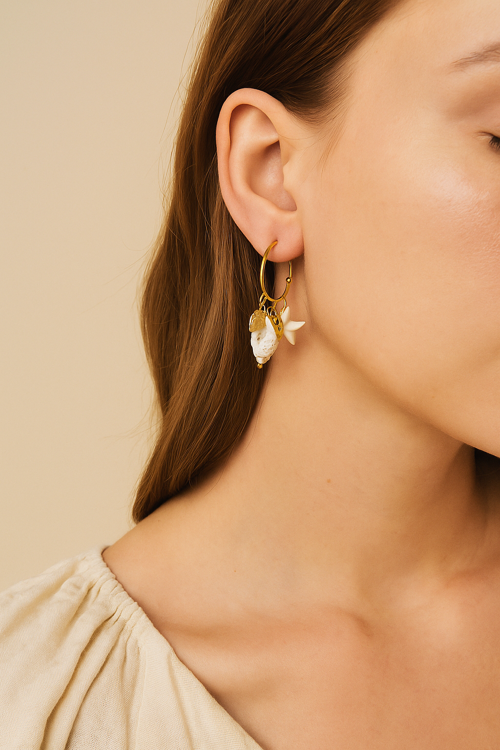 Bring the beach to your look with these gold hoops featuring a starfish, shell, and textured coin charm. Lightweight, playful, and perfect for your next getaway.