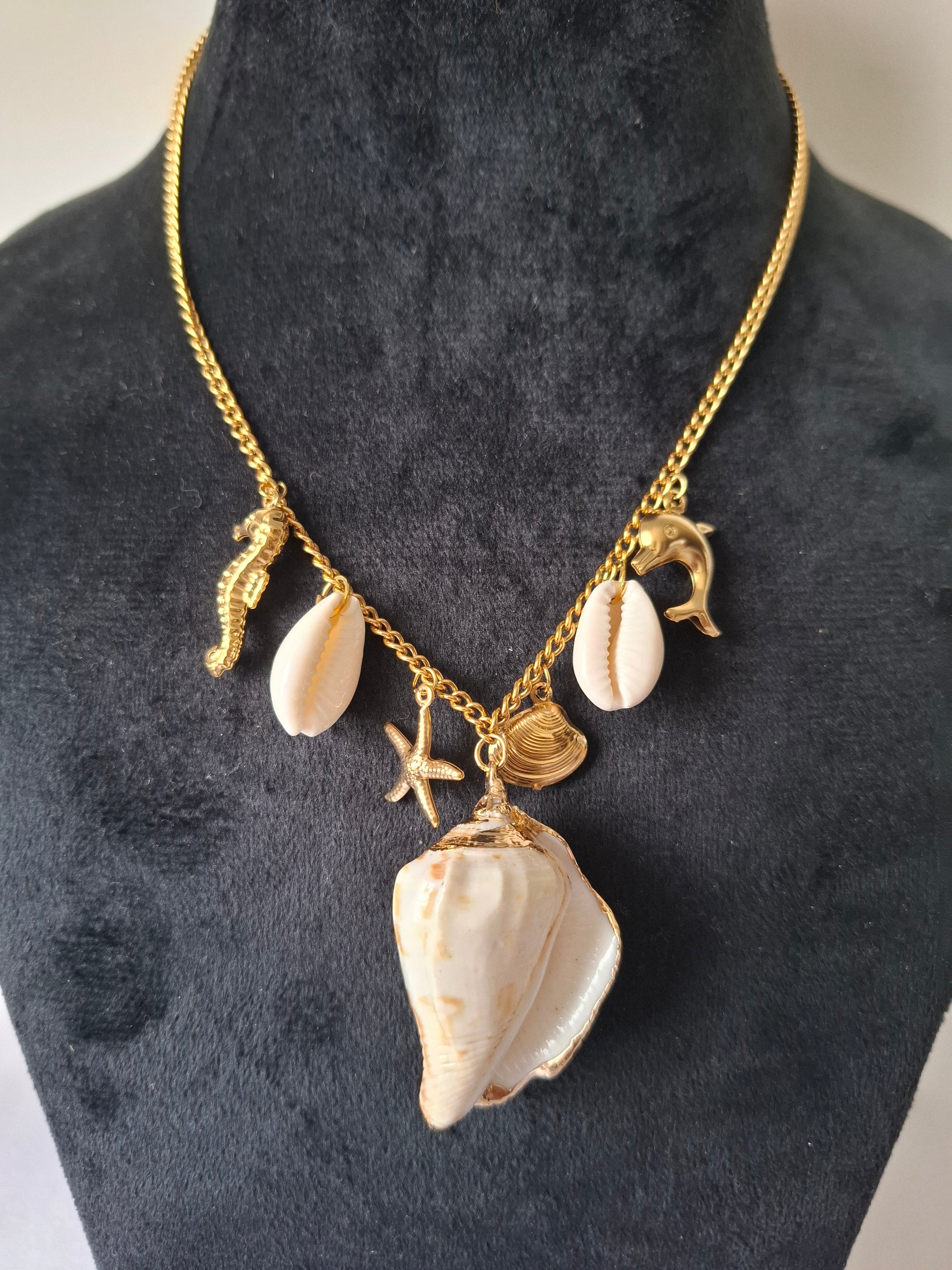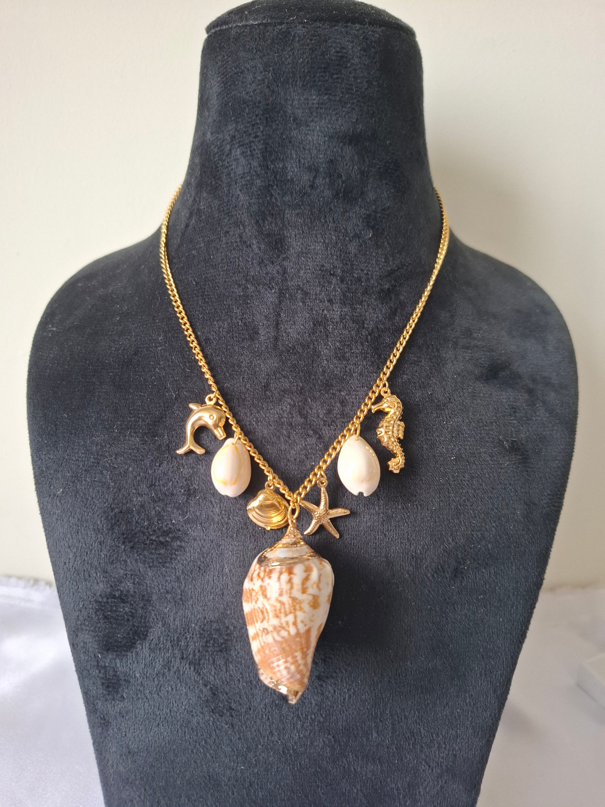 Shankh-starfish-kaudi-seahorse-dolphin-clam, one of a kind gold plated beautiful necklace.