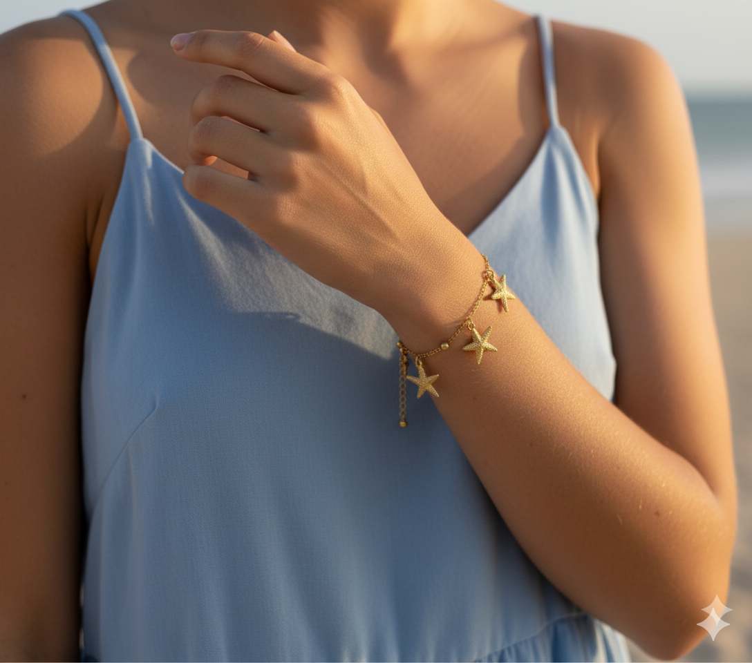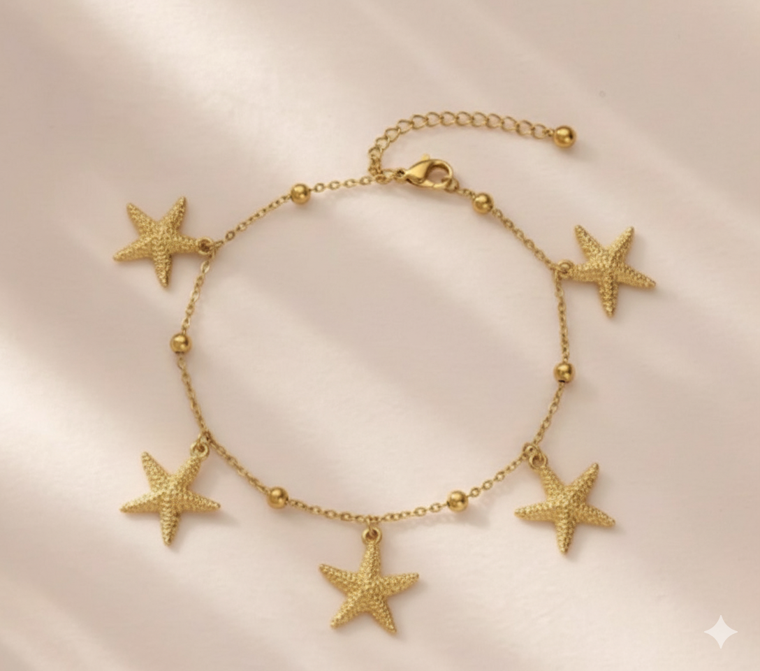 Bring the ocean to your wrist โ a delicate chain bracelet with tiny starfish charms for that beach-babe energy.